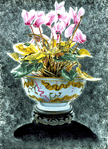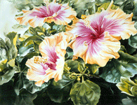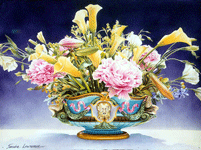 This page has thumbnail images of flowers, natural and potted. Included are hibiscus, tulips,three different images of hybrid tea roses, cyclamen, godetia, mallow, chrysanthemum and a minton jardinière, begonias and others, with associated insect life. Click on any individual thumbnail to go to its blow up page. You then have the option to buy limited edition giclée prints of that image on either canvas or paper..